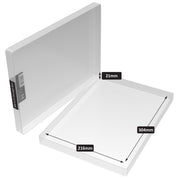 Boîte de présentation ou de rangement en plastique mince pour papier A4, parfaite pour stocker ou présenter des supports imprimés de manière intelligente et professionnelle. La conception en deux parties signifie qu'il n'y a pas de loquets ou de charnières cassables. D'une profondeur interne de 21 mm, cette boîte peut contenir jusqu'à 150 feuilles de papier A4.