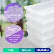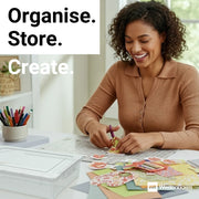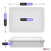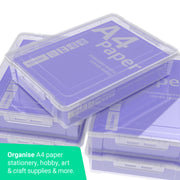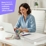 Clear plastic oversize A4 storage boxes with clip on lids. Ideal for a variety of storage applications in the home, office, classroom or craftroom. Easily store pens & pencils, art tools and materials, paper and stationery, model making supplies and much more in these verstile boxes. They feature locating feet on the base so that they can be safely stacked, and a unique double clip catch on each end of the lid for extra secure fastening, ensuring no spills during transportation. Made in Britain from Polypropylene a recyclable material